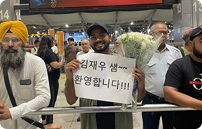 경유지인 인도 델리 공항에 도착했을 때 제이가 입국장에서 플래카드와 꽃다발을 안고 저를 반겼습니다. 제이는 2018년 인도 원정대 2기 때 맺은 소중한 인연입니다. 당시 네루대 한국어학과 학생이었던 그는 어느새 졸업하고 한국계 회사 인도 법인에서 통역을 담당하고 있습니다. 저와는 6년 만의 재회였습니다. 바그도그라로 가는 국내선 비행기가 다음날 오전에 있었기에 제이와 함께 저녁을 먹으며, 그간의 밀린 이야기를 아낌없이 나눴습니다.
