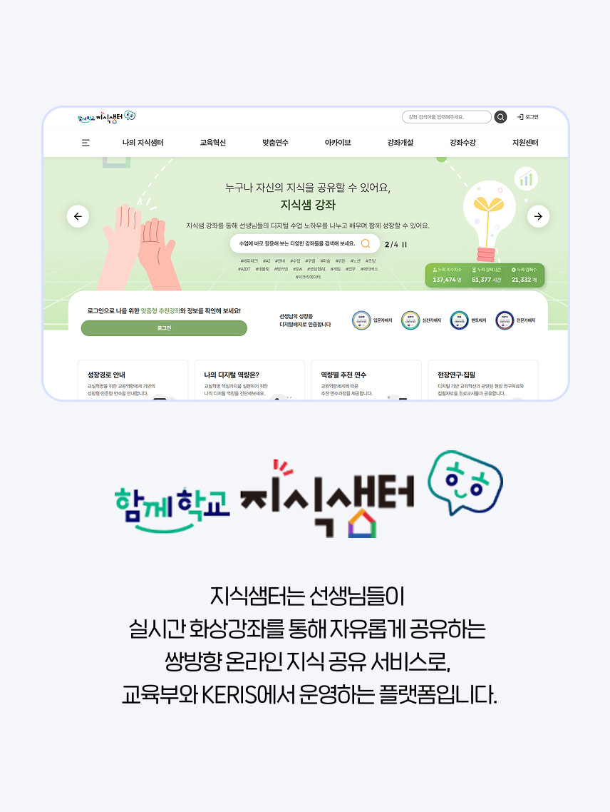 지식샘터는 선생님들이 실시간 화상강좌를 통해 자유롭게 공유하는 쌍방향 온라인 지식 공유 서비스로, 교육부와 KERIS에서 운영하는 플랫폼입니다.